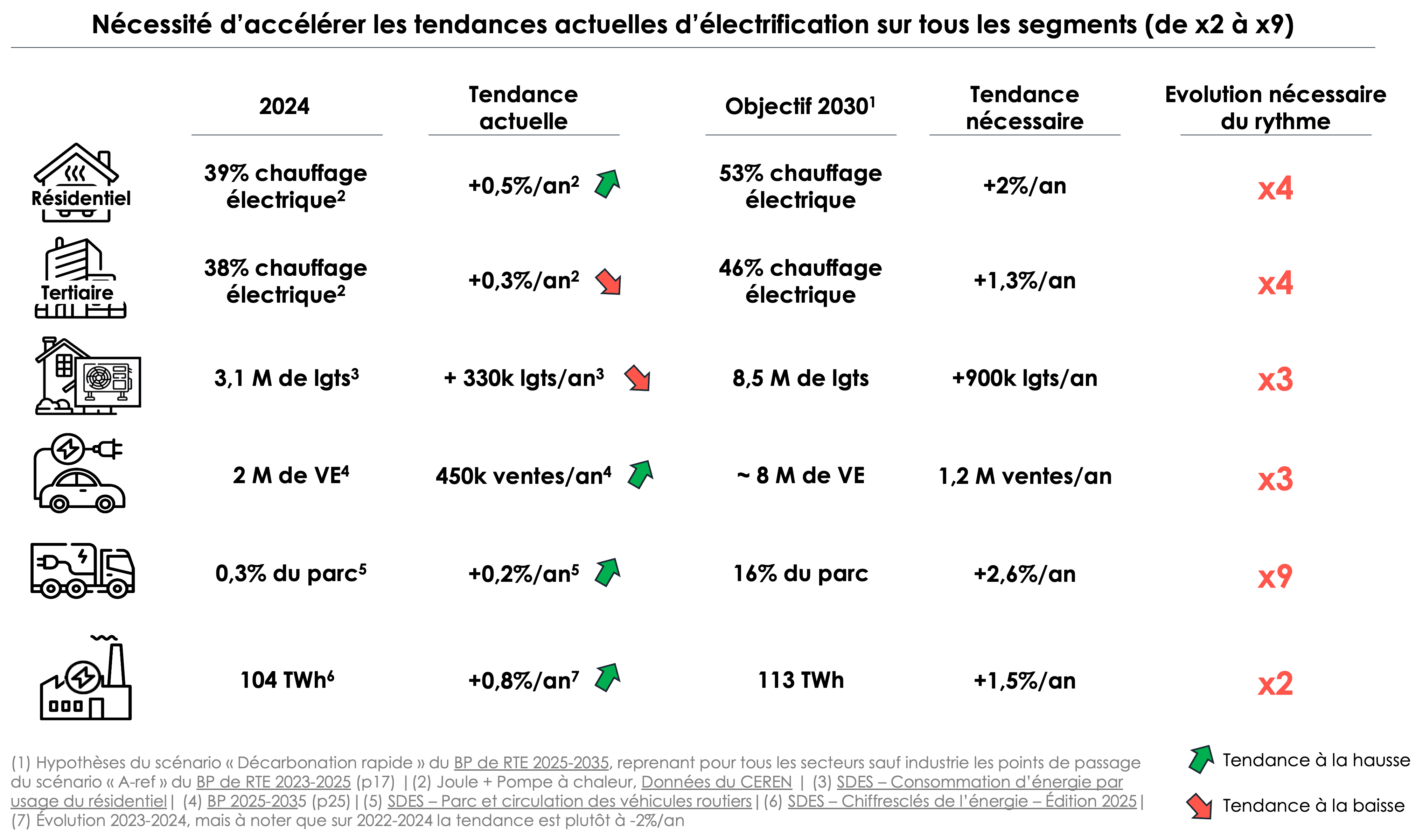 Autrement dit, le rythme actuel d’électrification des principaux usages est insuffisant pour absorber la hausse de la production et décarboner l’économie française au bon niveau. Pour ce faire, il devrait être multiplié par 2 à 9, en moins de 5 ans, comme précisé dans le tableau suivant.