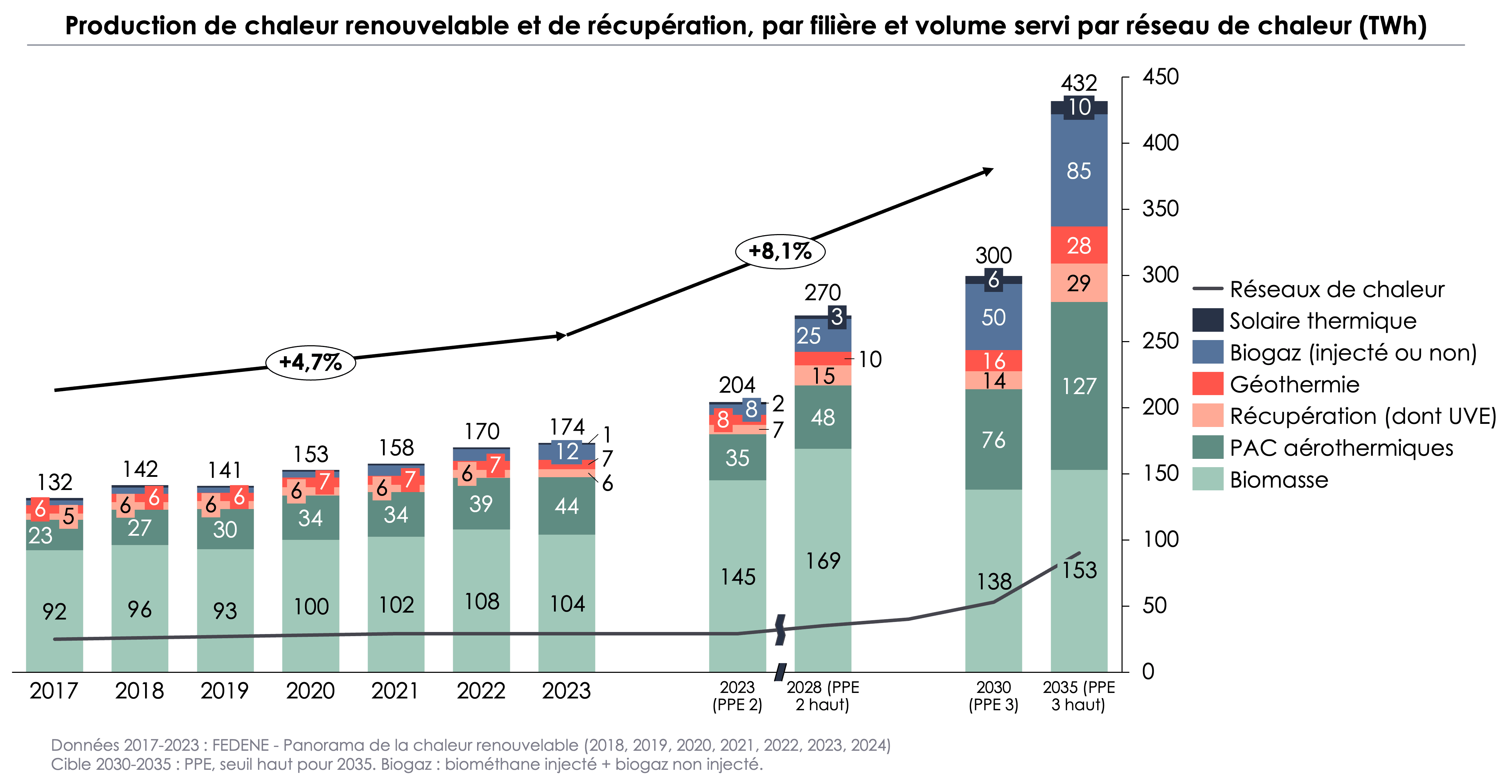 Le déploiement des énergies renouvelables et de récupération (ENR&R) pour la production de chaleur nécessite un quasi doublement de la croissance annuelle sur la prochaine décennie, avec des rythmes différents selon les filières.