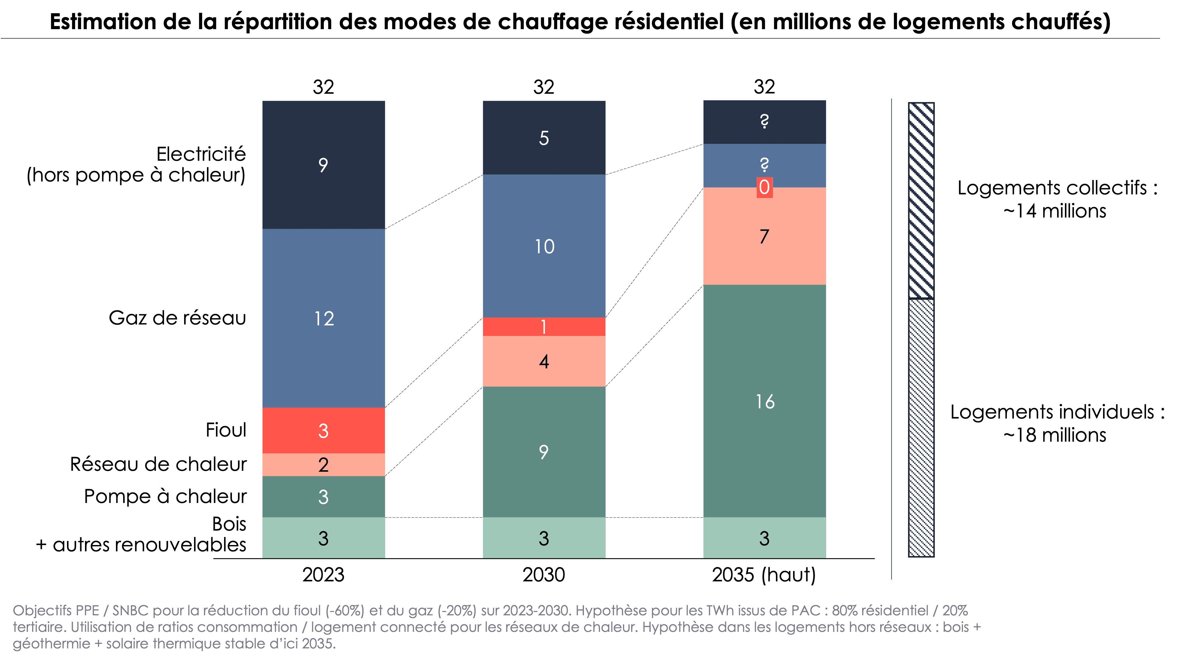 Pour appréhender l’impact des objectifs de production d’énergie bas-carbone à 2035, traduisons-les en nombre de logements[26]. Sur les 32 millions de logements chauffés, il faudrait passer, entre 2023 et 2035, de 3 à 16 millions de logements chauffés avec une PAC et de 2 à 7 millions de logements raccordés à un réseau de chaleur.
