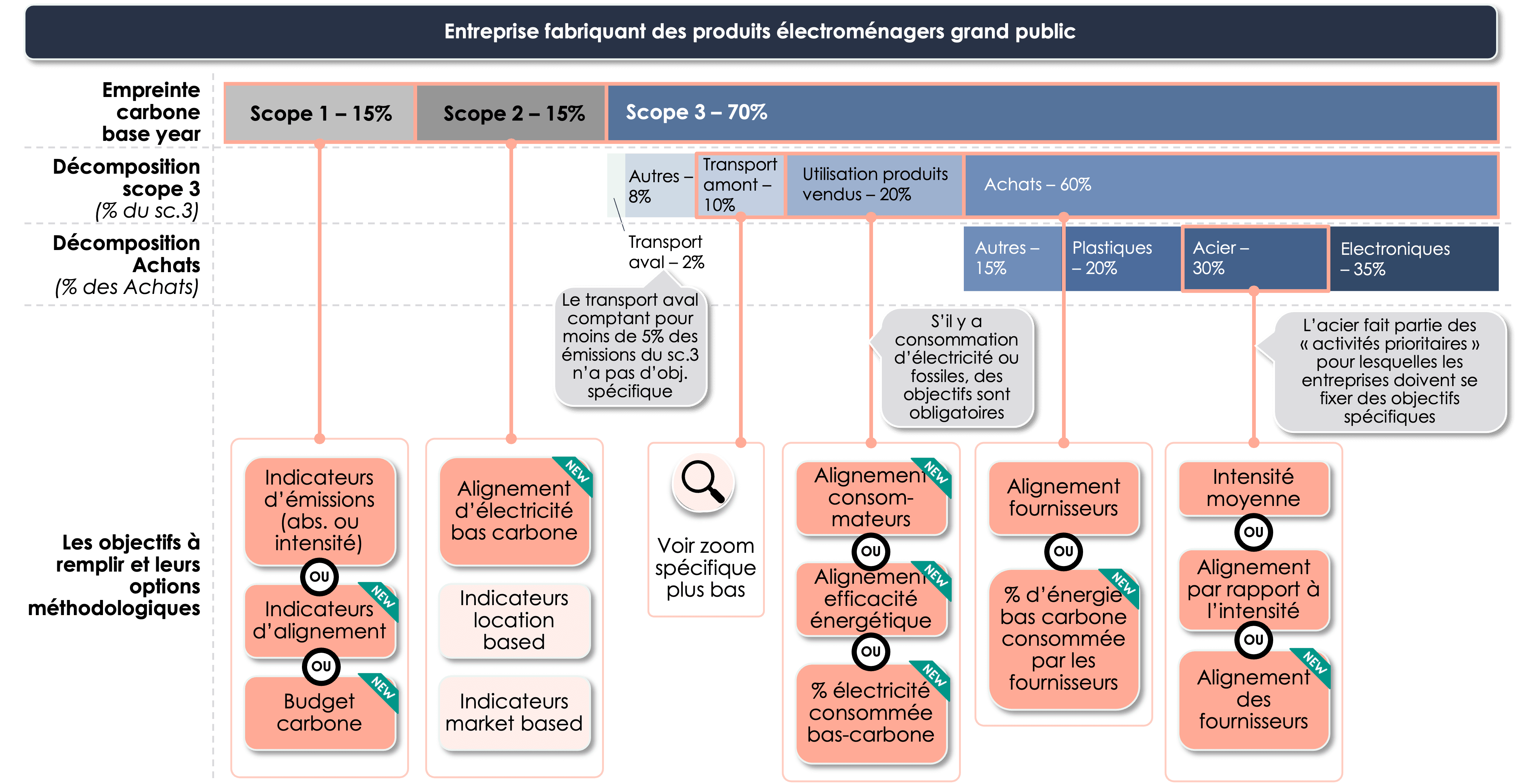 Le nouveau draft propose une approche très détaillée pour le scope 1, en distinguant différents types d’activités et en intégrant des objectifs par levier d’action. Parmi les nouveautés :