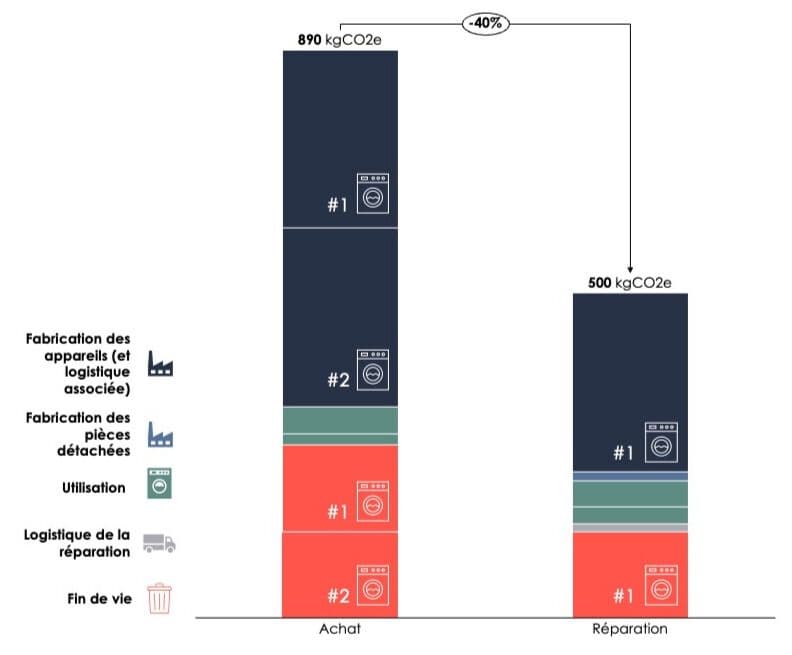L’efficacité énergétique d’un produit neuf est parfois meilleure que celle du produit à réparer. Par exemple, la machine en achat neuf est légèrement plus efficace énergétiquement (gain lié à une mise sur le marché plus récente) mais la part des émissions liées à l’utilisation étant faible, l’ordre de grandeur reste le même. Dans les cas où le produit neuf consomme de l’énergie plus décarbonée ou qu’il est beaucoup plus récent, le gain carbone lié à la consommation énergétique du produit neuf permet une telle décarbonation de l’usage, tandis que la réparation ne présente plus d'intérêt d’un point de vue climatique.