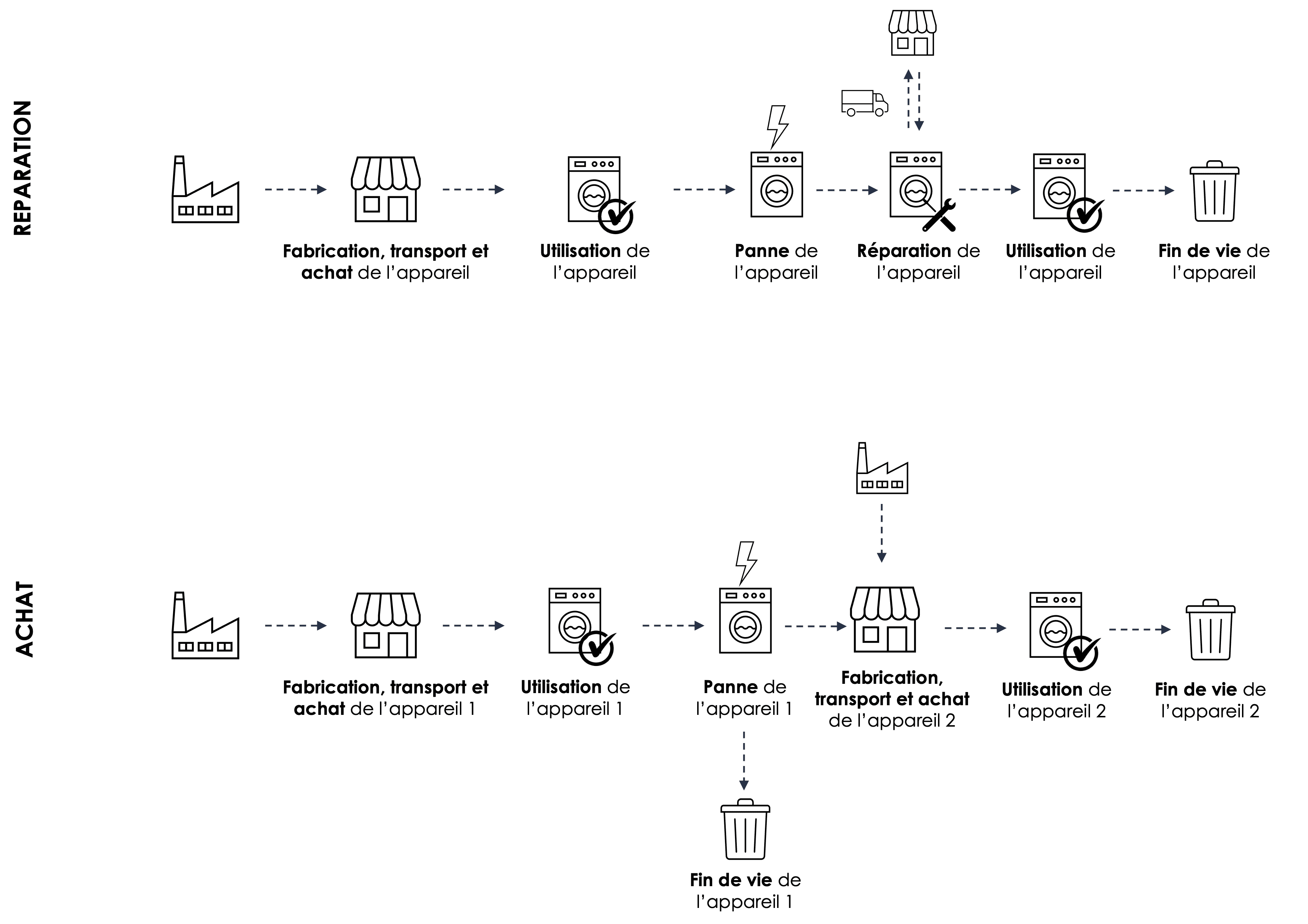 La réparation peut être réalisée sur des appareils ménagers comme professionnels. Nous avons développé l’exemple de la machine à laver dans la vie quotidienne pour des raisons de disponibilité des données publiques, mais ces calculs peuvent tout aussi bien être réalisés à une échelle industrielle.