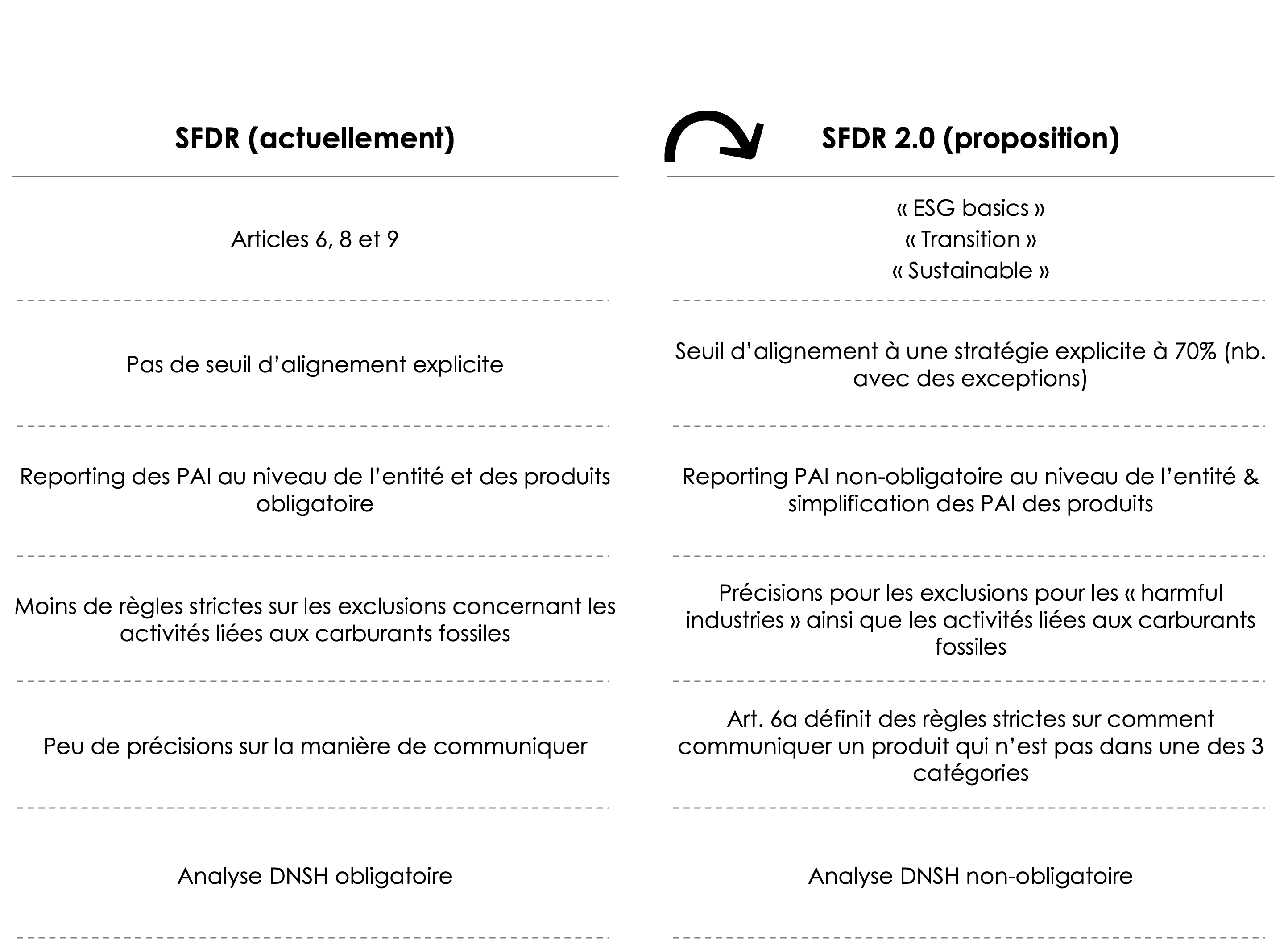 Tout d’abord, nous félicitons les efforts de redéfinition de « l’investissement vert » avec des catégories plus claires. De plus, SFDR 2.0 renforce les critères d’exclusions, notamment pour les catégories « transition » et « sustainable », qui sont alignées avec ceux du Paris-Aligned Benchmark (PAB)[2]. La suppression de l’analyse DNSH pourrait donc être en partie compensée par le respect de ces exclusions. Ensuite, le plan de transition reste un indicateur clé pour SFDR 2.0 (il n’a pas été supprimé parmi les PAI) ce qui favorise l’action concrète. Ces éléments traduisent un réel effort pour lutter contre le greenwashing, explicité par l’Art 6a.