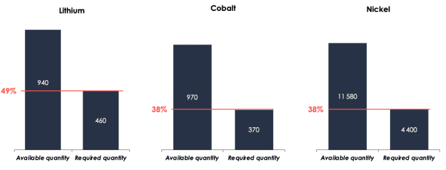According to the same study, even in the most conservative scenario (unfavourable technological switch, pessimistic battery recycling scenario, strong growth in battery capacity per vehicle, etc.), the metal reserves identified in 2024 will cover more than double the demand by 2050, as shown in the following figure.