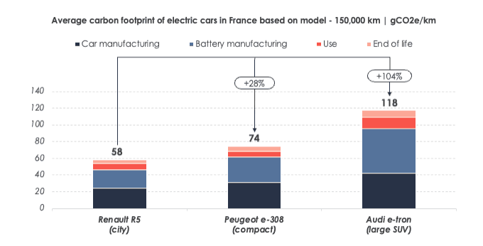 Average carbon footprint of electric cars in France based on model - 150,000 km | gCO2e/km
