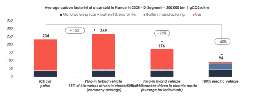 Average carbon footprint of a car sold in France in 2025 – D-Segment – 200,000 km | gCO2e/km