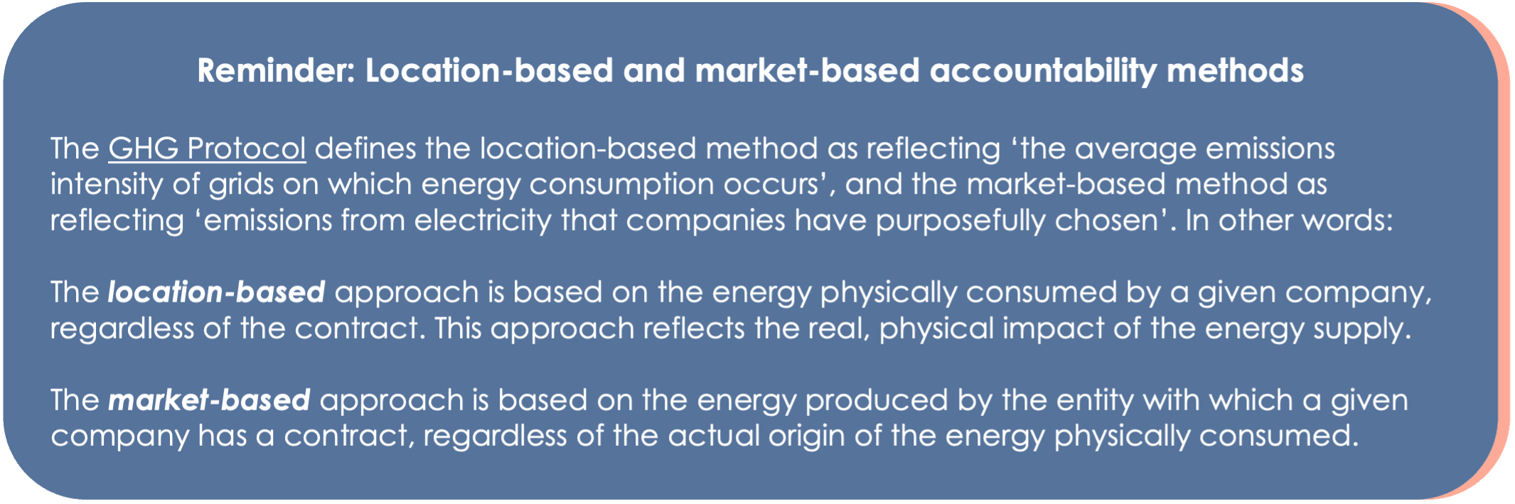 - Some countries such as France already impose accounting for emissions using the location-based method in its regulation. The Corporate Sustainability Reporting Directive (CSRD) [18] adds an obligation for all companies reporting in the EU to report using the location-based method. More globally, compliance with the GHG Protocol requires to report using the location-based method as well if a market-based value for Scope 2 emissions is given.