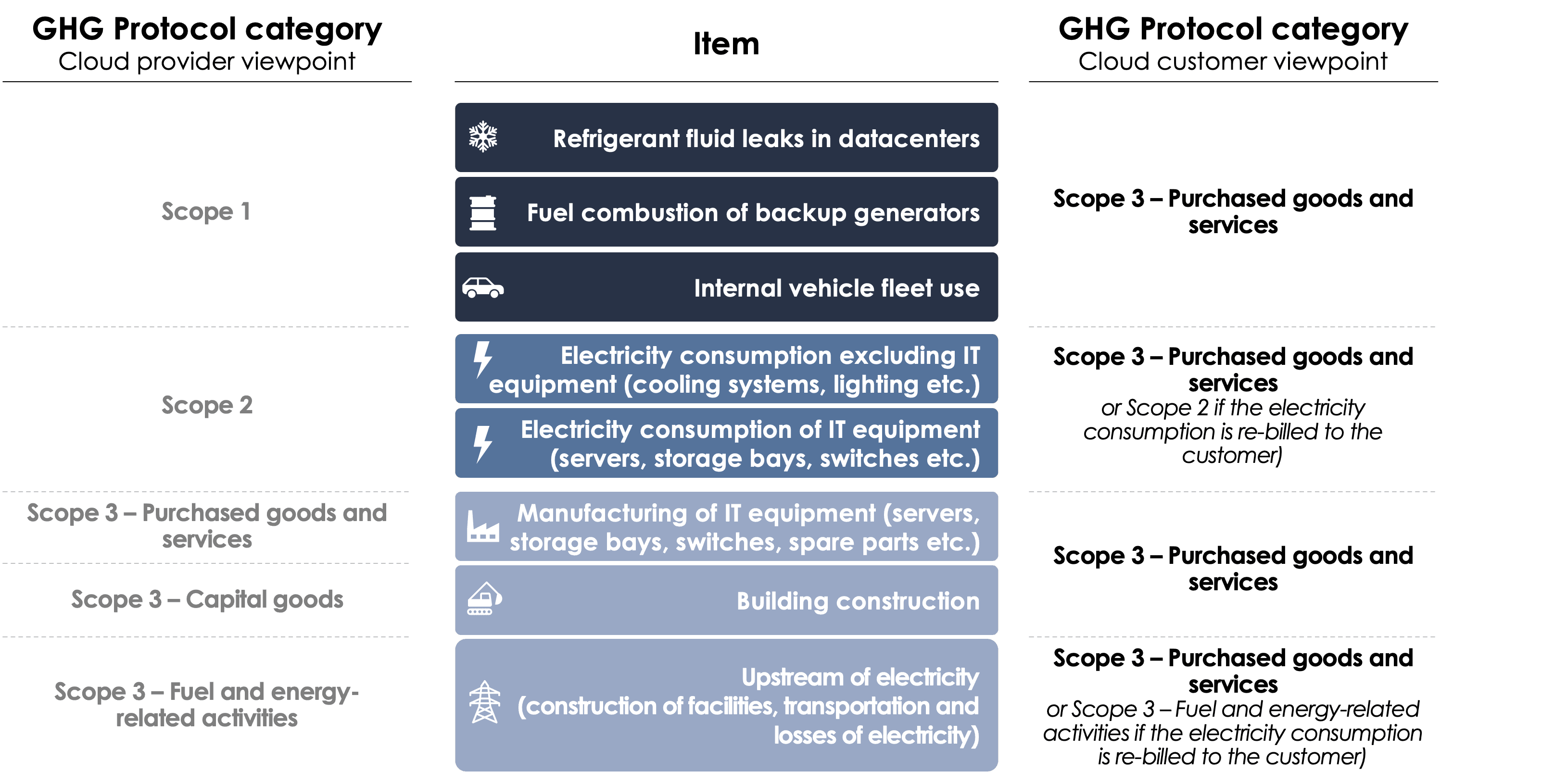 The figure below shows the main emission sources of Cloud services and how to account for them, highlighting which category of the GHG Protocol it falls under depending on the point of view of the reporting company:
