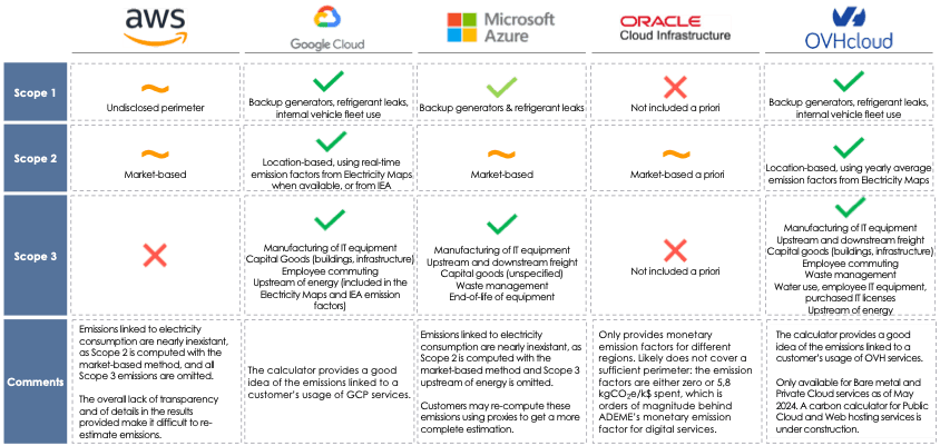 The main cloud providers’ carbon neutrality claims have not matured much over the years: Amazon still wishes to reach ‘net-zero across its operations by 2040’, Microsoft are still committed to being ‘carbon negative by 2030’ ; despite the absence of a clear scientific definition for ‘carbon neutral’ company [9] and the misleading nature of this terminology. Google has dropped its ‘carbon neutral since 2007’ claim in favor of a ‘net-zero by 2030’ objective. Other large-scale cloud providers such as Oracle and Alibaba Cloud aim for “carbon neutrality” by 2025 and 2030, respectively.