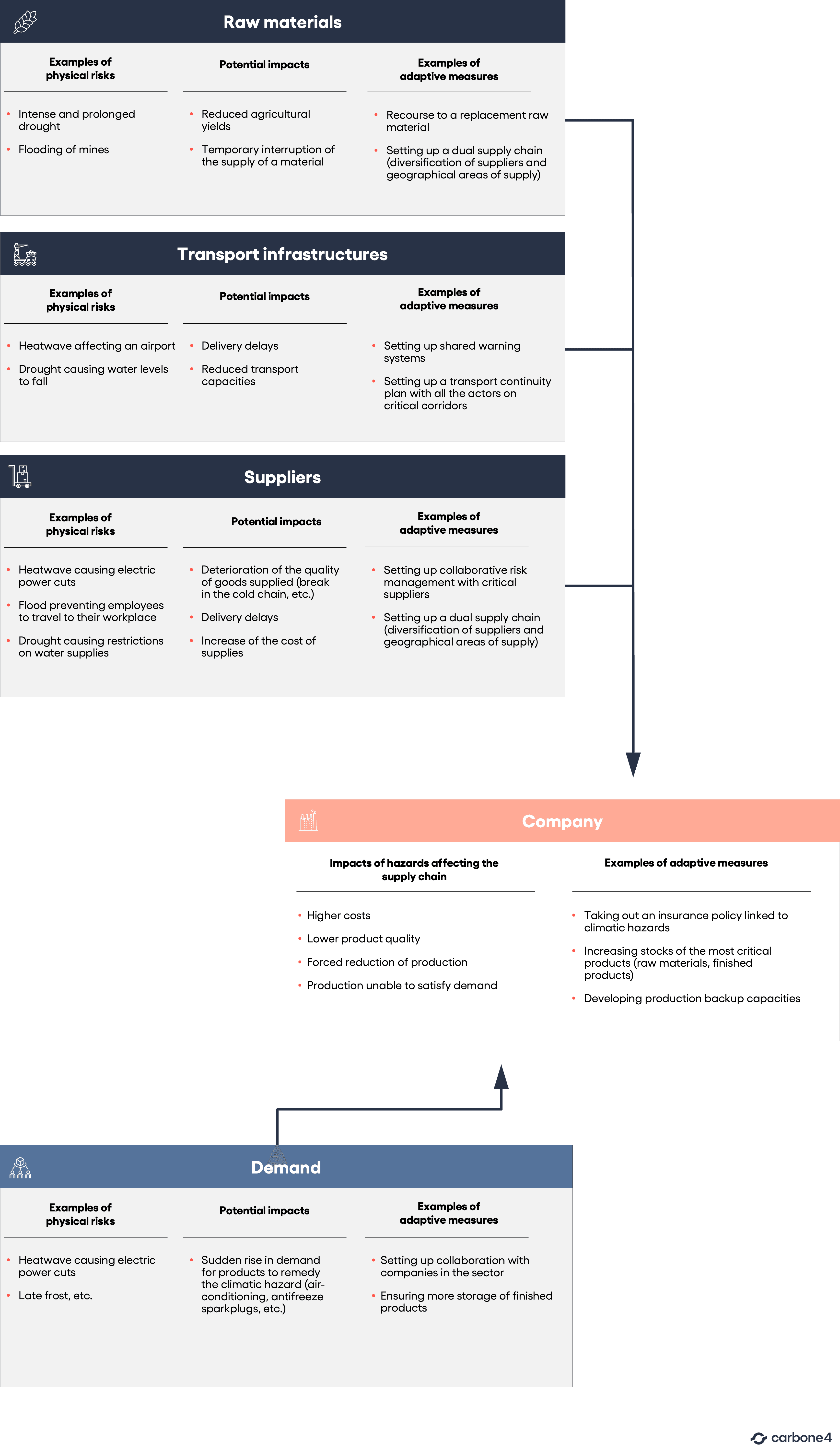 A company can see its operations deteriorate indirectly due to the occurrence of a climatic hazard upstream or downstream of its supply chain. Different strategies can be implemented to ensure greater resilience to cope with these events, by collaborating with the different actors of the supply chain and/or by carrying out more company-focused approaches.