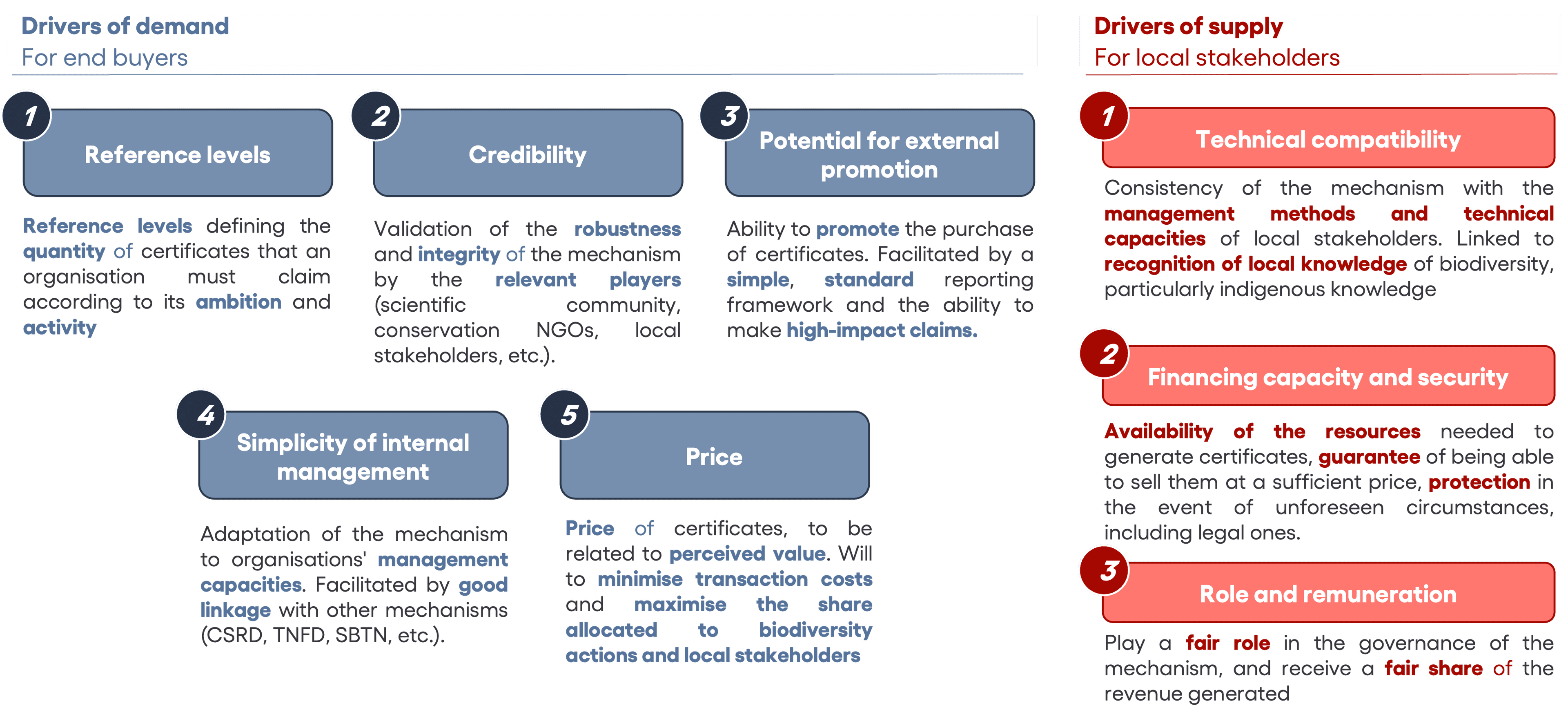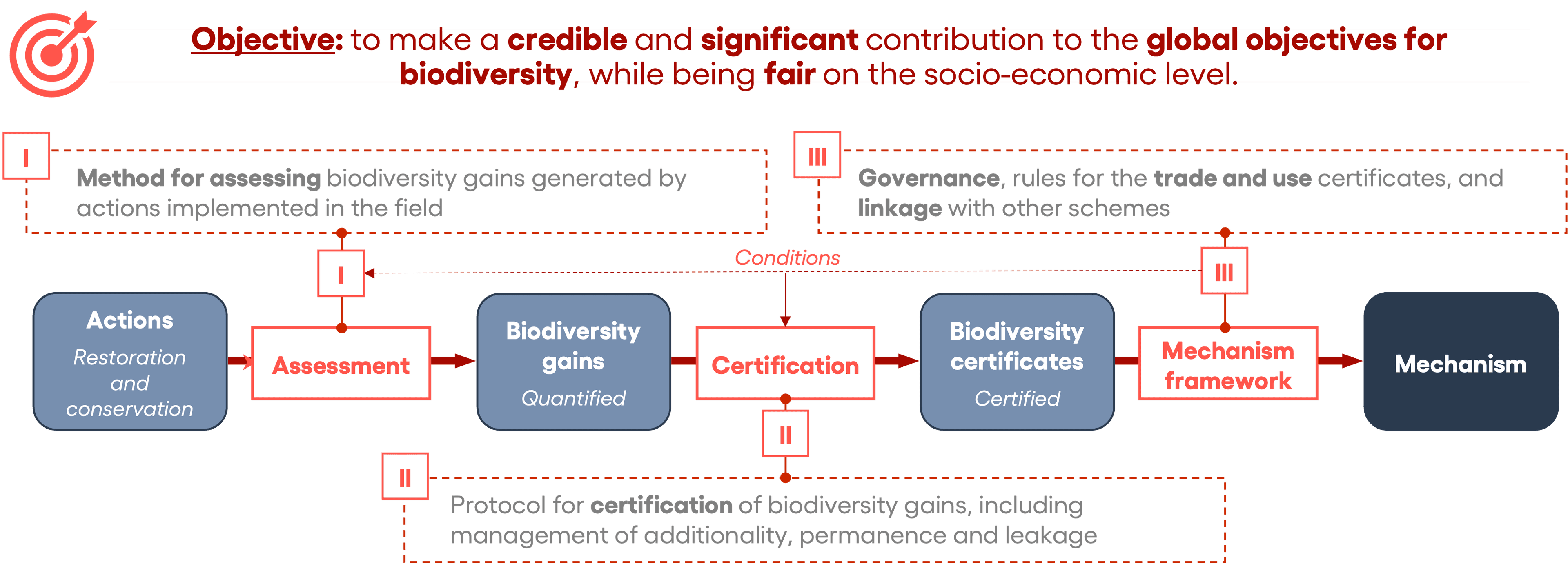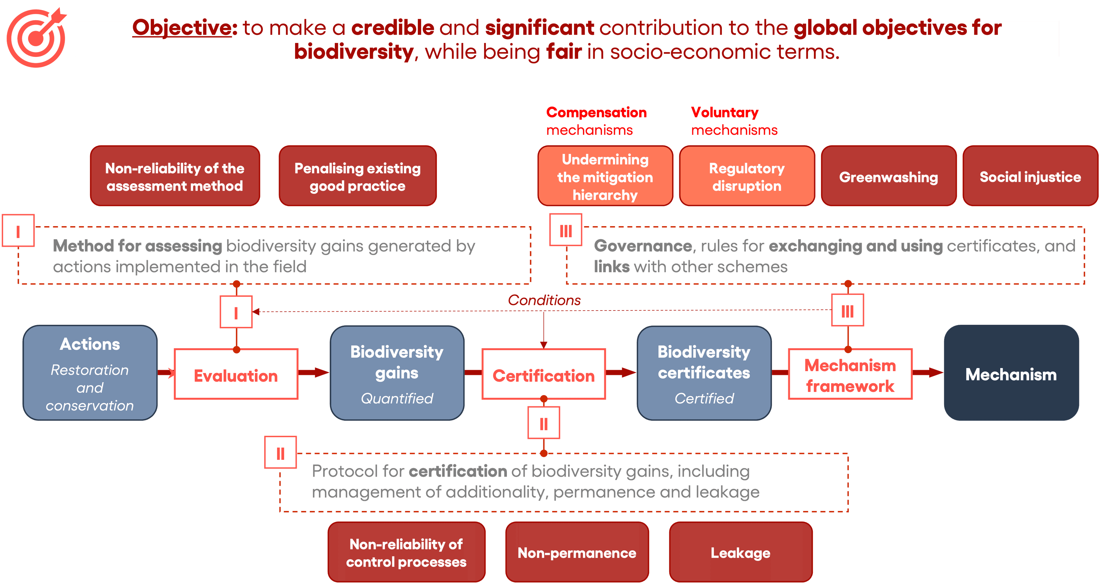 To cover all the issues, risks and opportunities, we consider these mechanisms in the general sense: voluntary or regulatory, compensation or contribution, for conservation and/or restoration. In the following, we prefer the term "certificates" to "credits" because the term "credit" is implicitly associated with an offset mechanism, whereas the term "certificate" is more general.