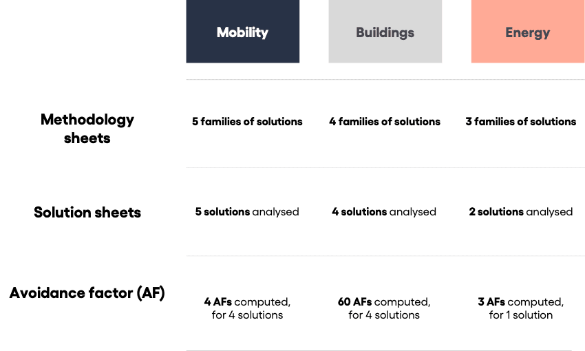 - Quantified applications for certain solutions in France: Avoidance Factors (FEv) to quickly estimate avoided emissions.