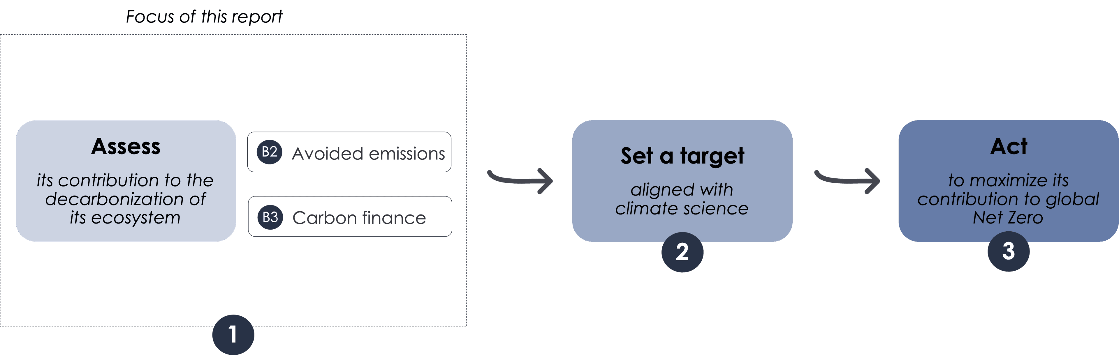 Implementing a strategy that contributes to global net zero via the decarbonization of your ecosystem (Pillar B) can be broken down into three steps, similar to the process used to decarbonise your activities (Pillar A).