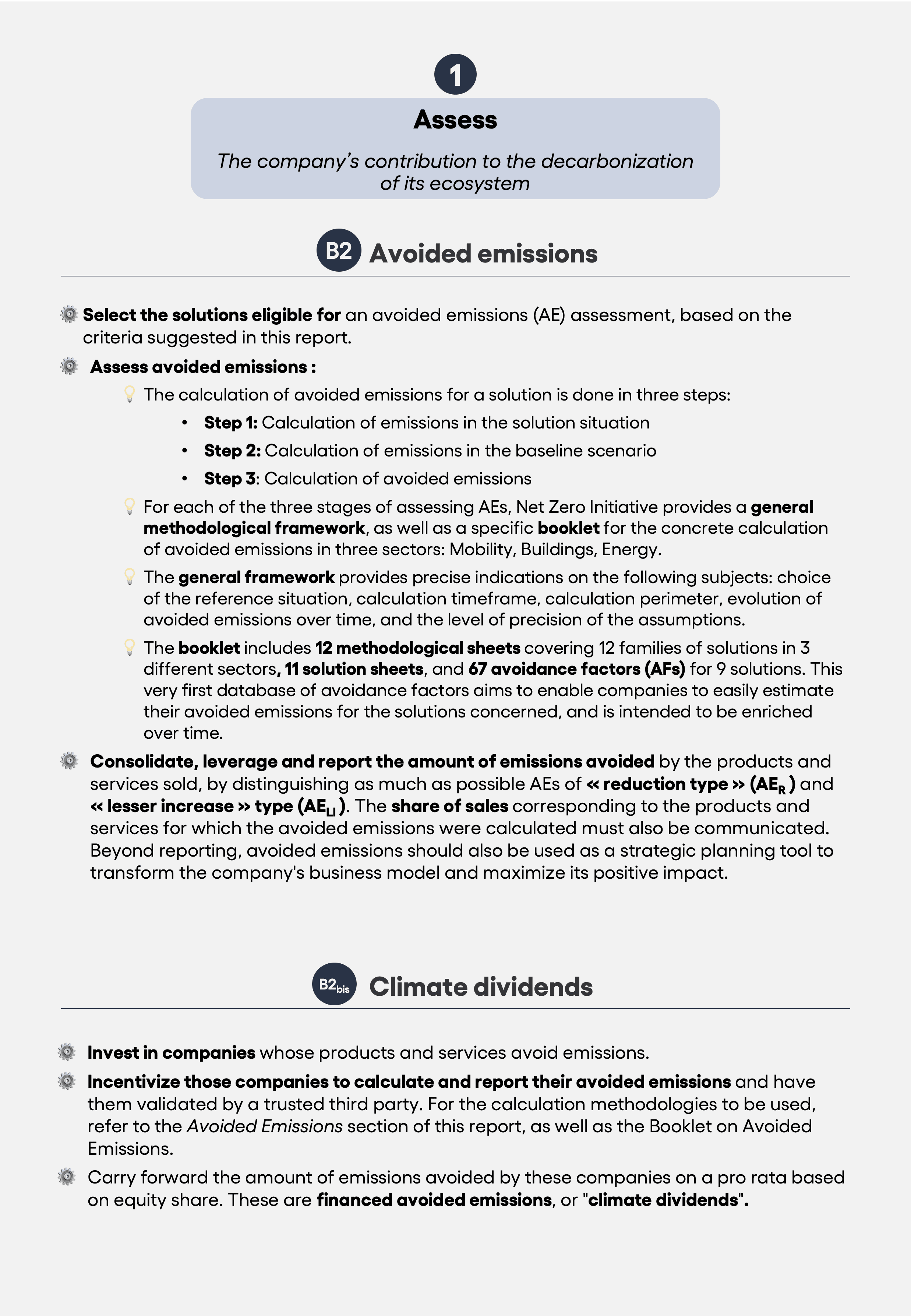 - calculating avoided emissions generated by the company's investments, that is to say the avoided emissions related to its investments. Climate dividends are the mirror image of category 3.15 of pillar A (emissions linked to investments) for pillar B avoided emissions.