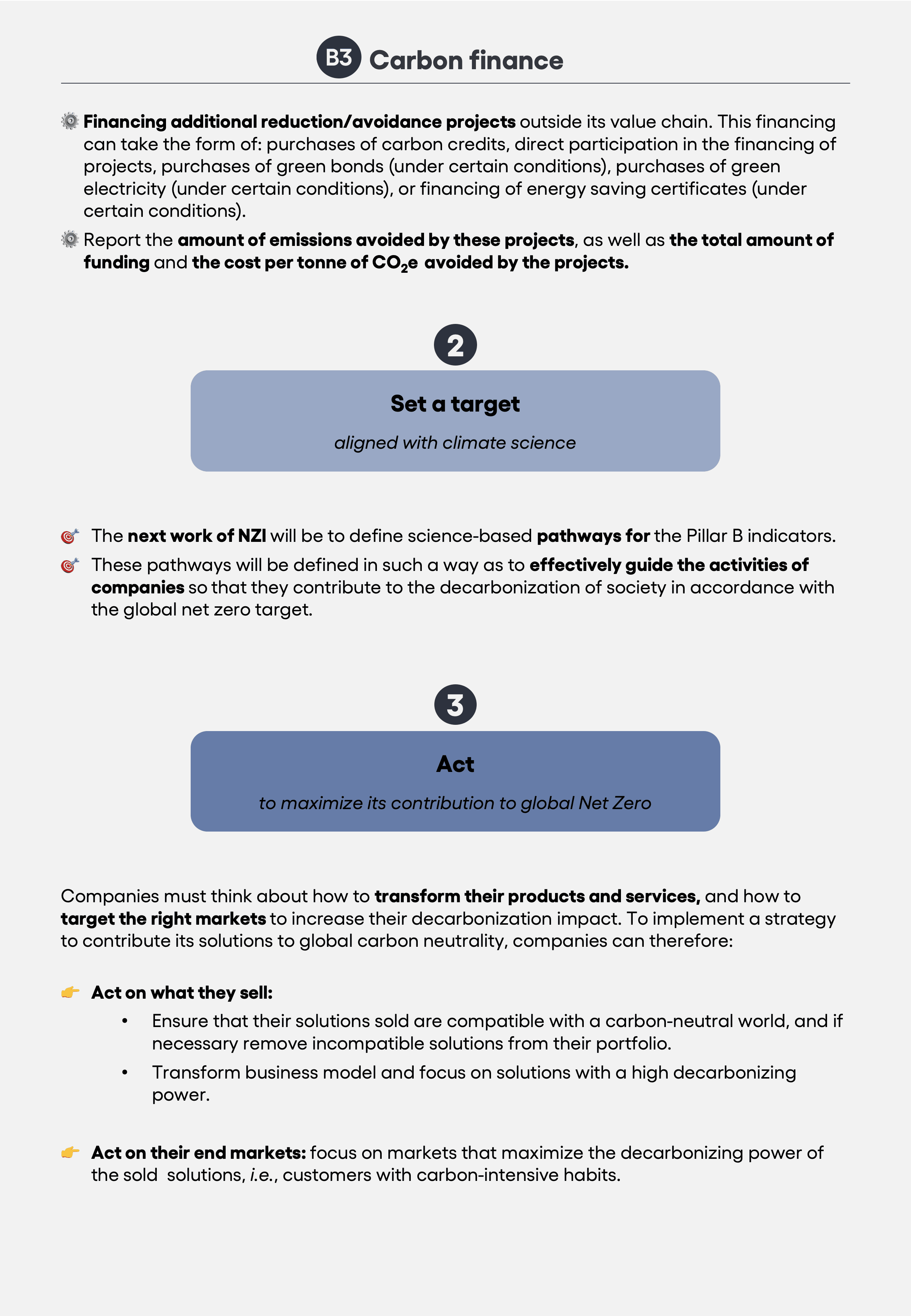 This document is the guide to understanding the second pillar of the NZI dashboard, also referred to as pillar B. Pillar B is aimed at quantifying a firm’s positive impact on the greenhouse gas emissions of its ecosystem. It is composed of two major families: