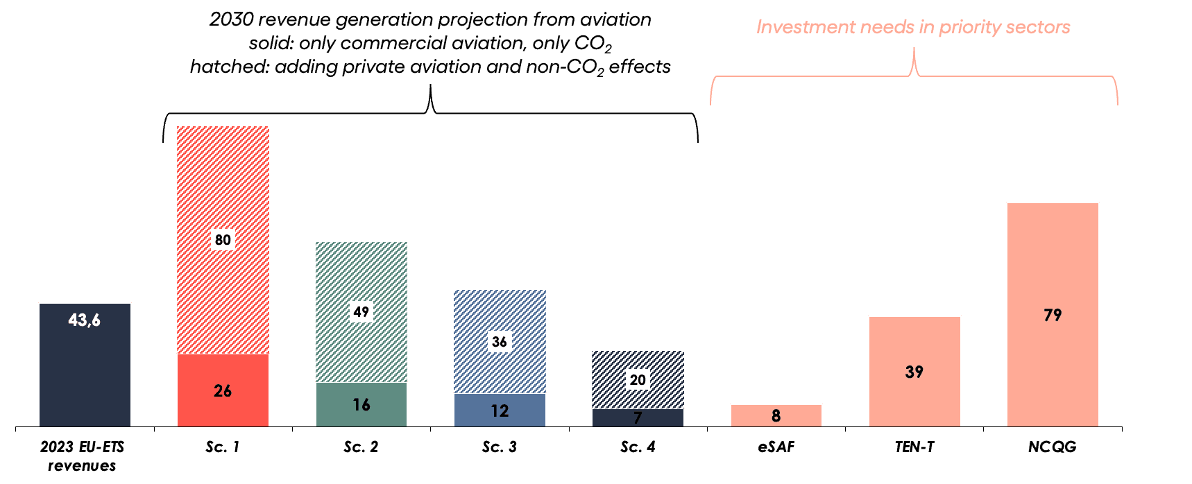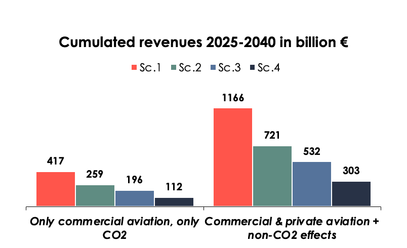 Bien sûr, le SEQE-UE ne suffira pas à lui seul à financer toutes ces mesures, mais il pourrait générer des recettes supplémentaires importantes, pouvant atteindre 1 160 milliards d'euros en 15 ans, selon le scénario et le périmètre, pour financer la transition, tout en tenant mieux compte de l'impact total de l'aviation sur le climat. L'extension du SEQE-UE pour l'aviation afin de couvrir l'ensemble de l'impact de l'aviation commerciale (sur le plan géographique, avec les jets privés et les effets non liés au CO2) pourrait donc générer les recettes les plus importantes pour financer ces investissements, tout en constituant une forte incitation pour l'aviation commerciale à accélérer sa décarbonisation, faisant ainsi d'une pierre deux coups.