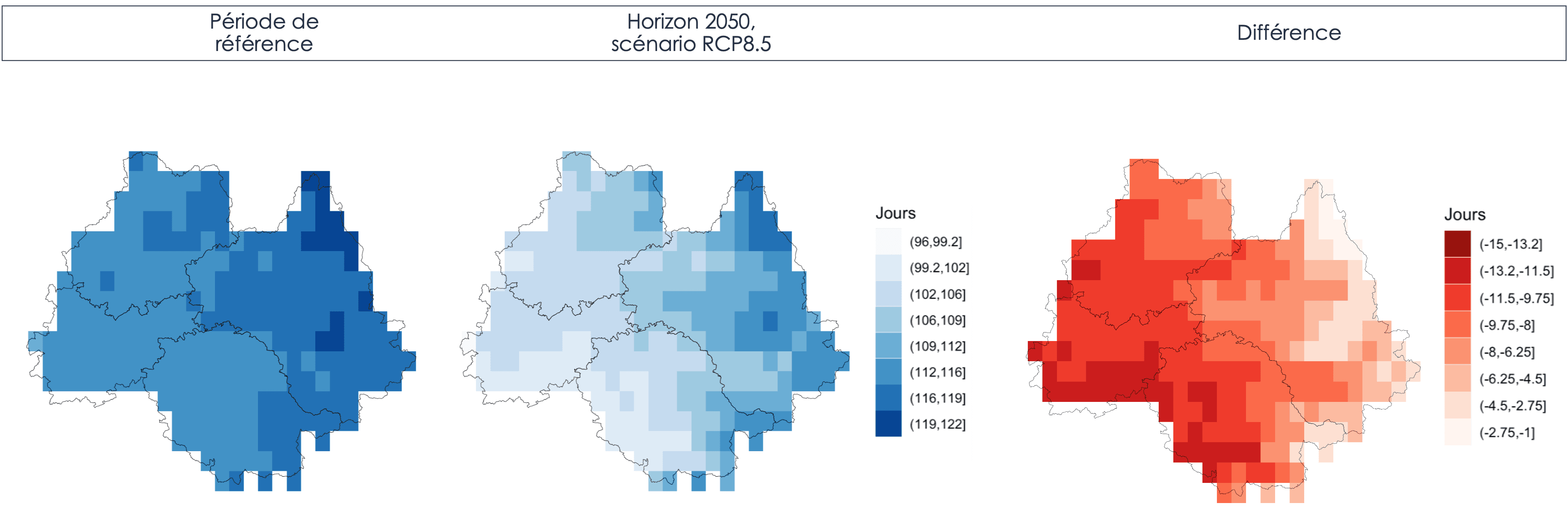 Le nombre de jours à plus de 25°C entre mai et juillet passe de 25 jours en moyenne dans la situation de référence à 36 jours d’ici 2050, soit une augmentation de plus de 11 jours [19]. Cette évolution est particulièrement critique pour les cultures de blé, où des températures trop élevées entre mai et juillet empêchent un bon remplissage du grain et induisent ainsi des pertes de rendement.