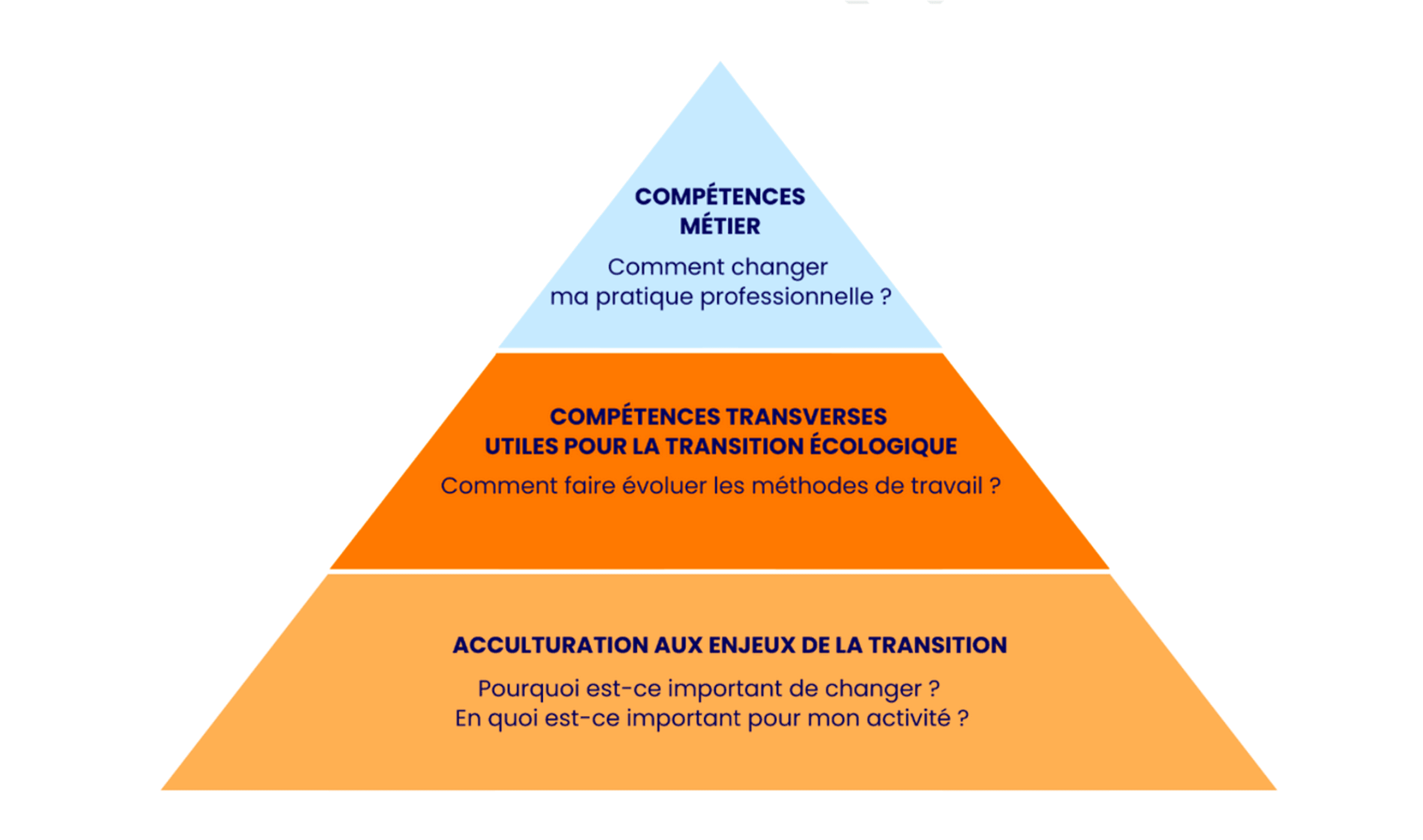 Cette représentation en pyramide proposée par le Shift reflète l'ordre traditionnellement souhaitable d'acquisition des compétences. Dans le même principe, l’approche pédagogique déployée par l’Académie Carbone 4 s’attache à restituer des connaissances, outils et méthodes fondamentales sur les thématiques phares de la transition – enjeux climat & biodiversité ; décarbonation ; adaptation – permettant de donner du sens pour faciliter ensuite l'évolution des pratiques métiers, au plus près des réalités du terrain.